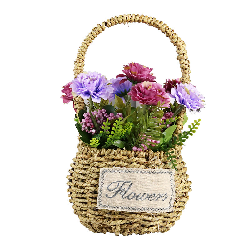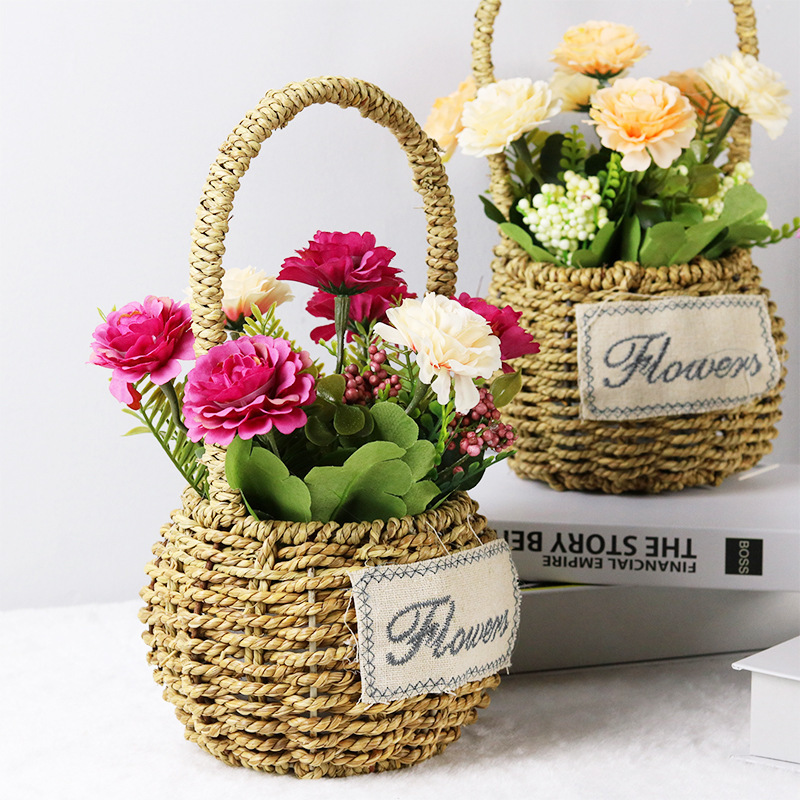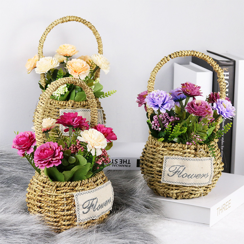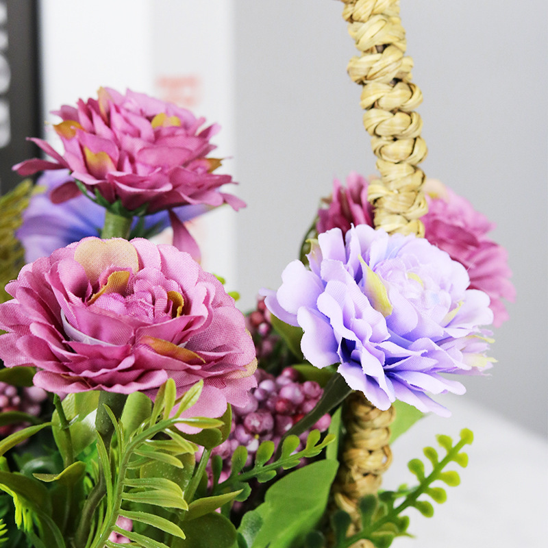 田园仿真牡丹花藤编花篮 北欧家居装饰摆件 假花盆栽