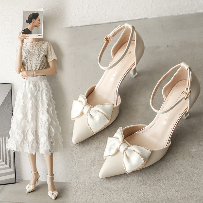 浅口一字扣带单鞋尖头细跟高跟凉鞋女小清新白色伴娘鞋