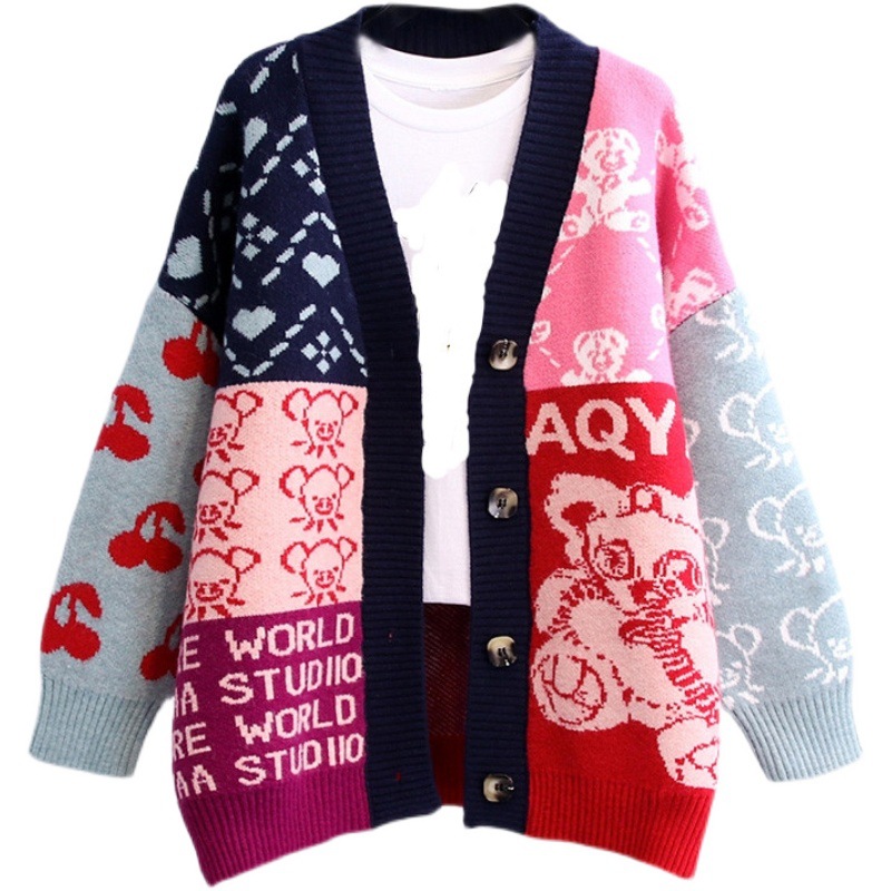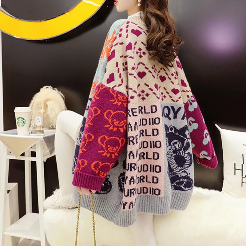韩版卡通中长款开衫宽松毛衣女慵懒风复古针织外套
