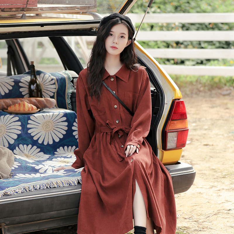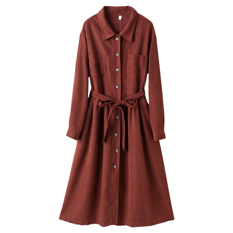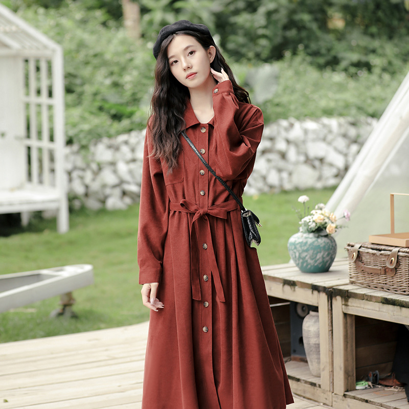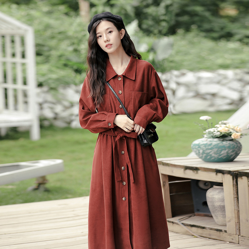 长款早秋气质女装法式复古长袖收腰灯芯绒红色连衣裙春秋