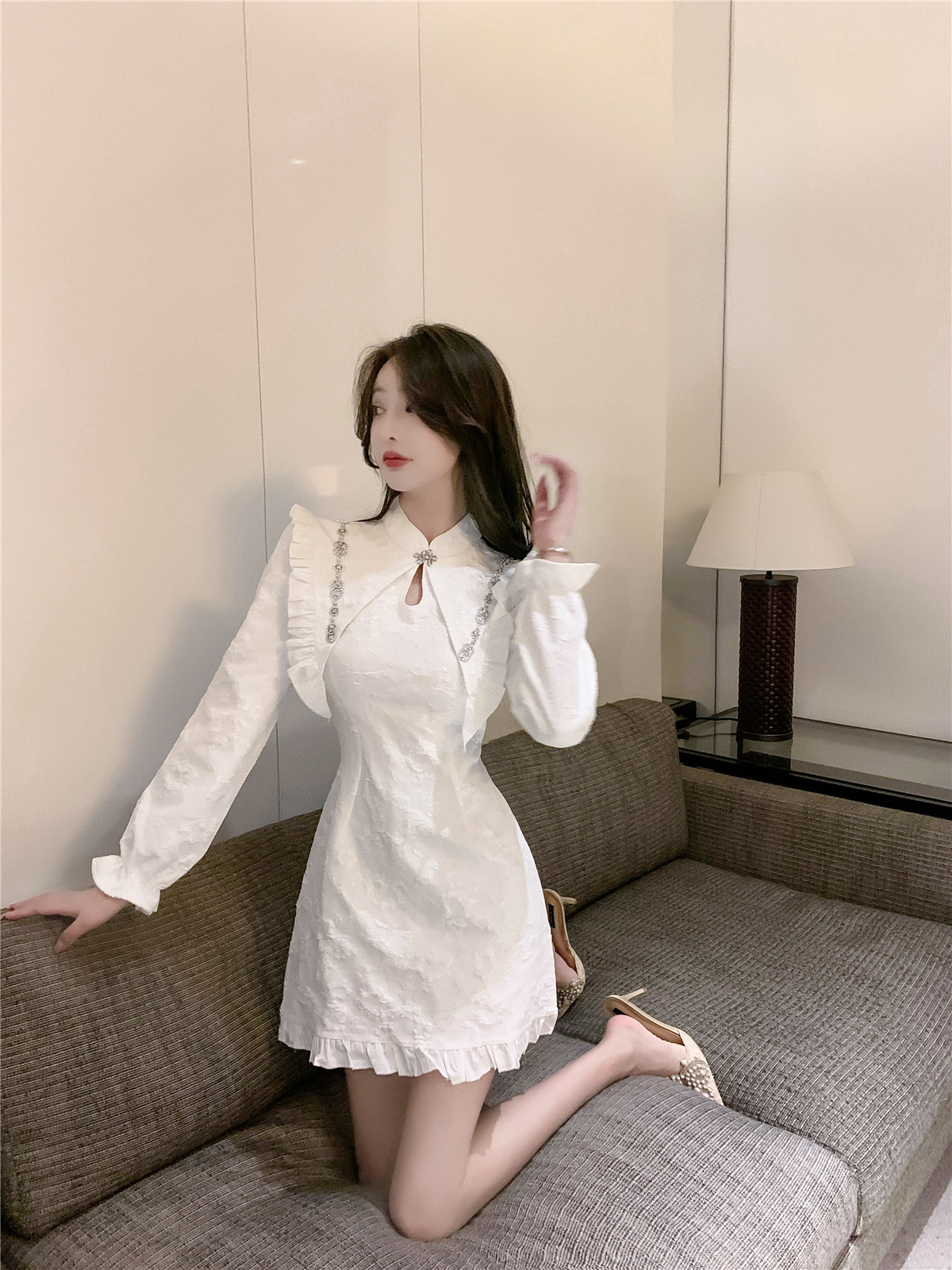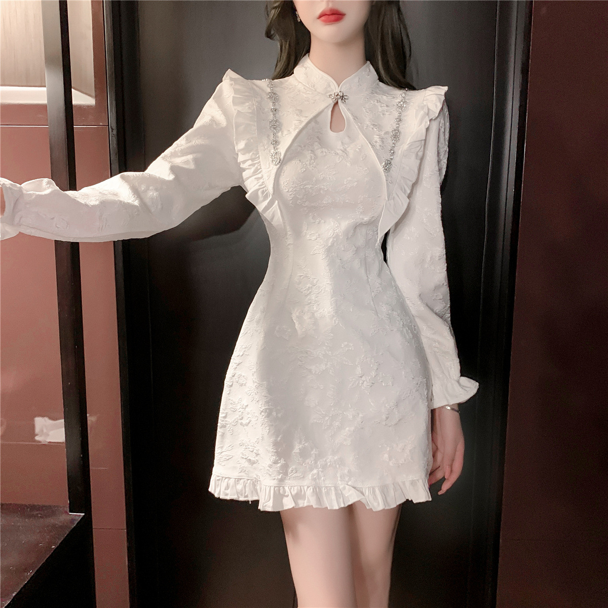 年轻款气质中国风改良版旗袍镶钻荷叶边连衣裙女装